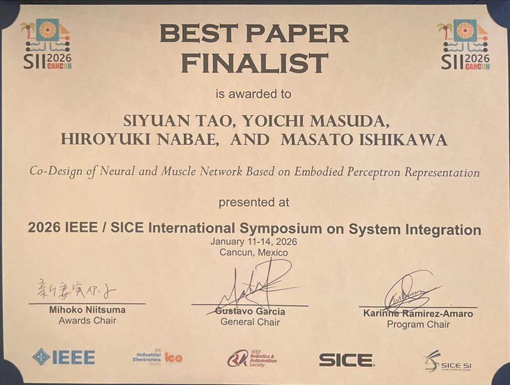 機械工学専攻の陶 斯遠さん(博士前期課程2年)、増田 容一 助教、難波江 裕之 准教授(東京科学大)、石川 将人 教授のグループが、「The 2026 IEEE/SICE International Symposium on System Integration (SII 2026) Best Paper Finalist」を受賞しました。